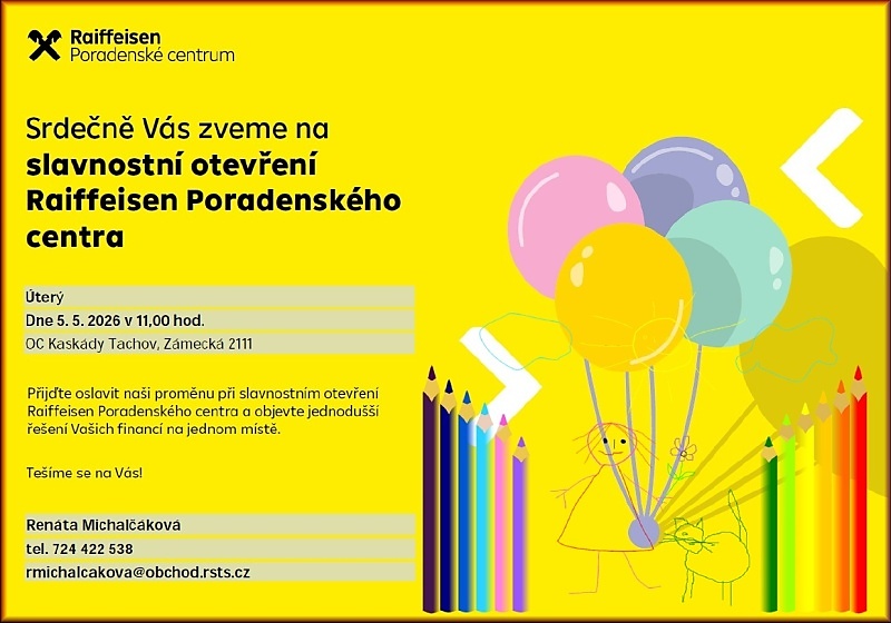 Více o připravované akci říká oblastní ředitelka Renáta Michalčáková. "Jde vlastně o krok blíže k lidem, tedy nejenom k aktuálním klientům, ale i široké veřejnosti. Vybrané kanceláře v kraji nově mění svůj brand na Raiffeisen Poradenská centra – místa, kde s vámi řeší nejen stavební spoření, ale celkový přehled a plánování vašich financí. A právě Tachov se představuje jako první, přijďte to oslavit s námi," zve na setkání v Tachově 5. května ředitelka Renata Michalčáková.
