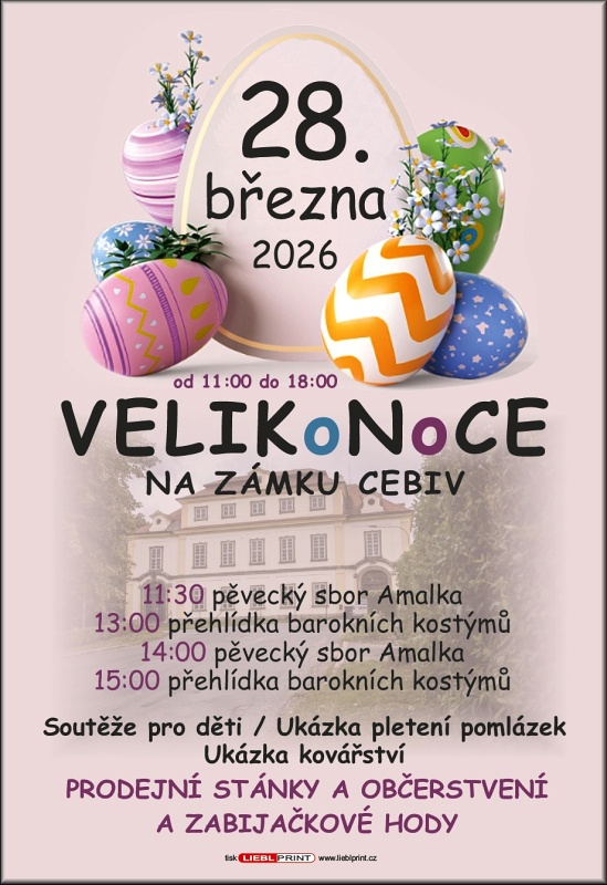 Nezapomeňte se přijít podívat v sobotu 28. března 2026 za zámecké Velikonoce do Cebivi! Čeká vás bohatý program, budete si moci vyzkoušet pletení pomlázek, uvidíte ukázky kovářství, pro děti budou připraveny různé soutěže!